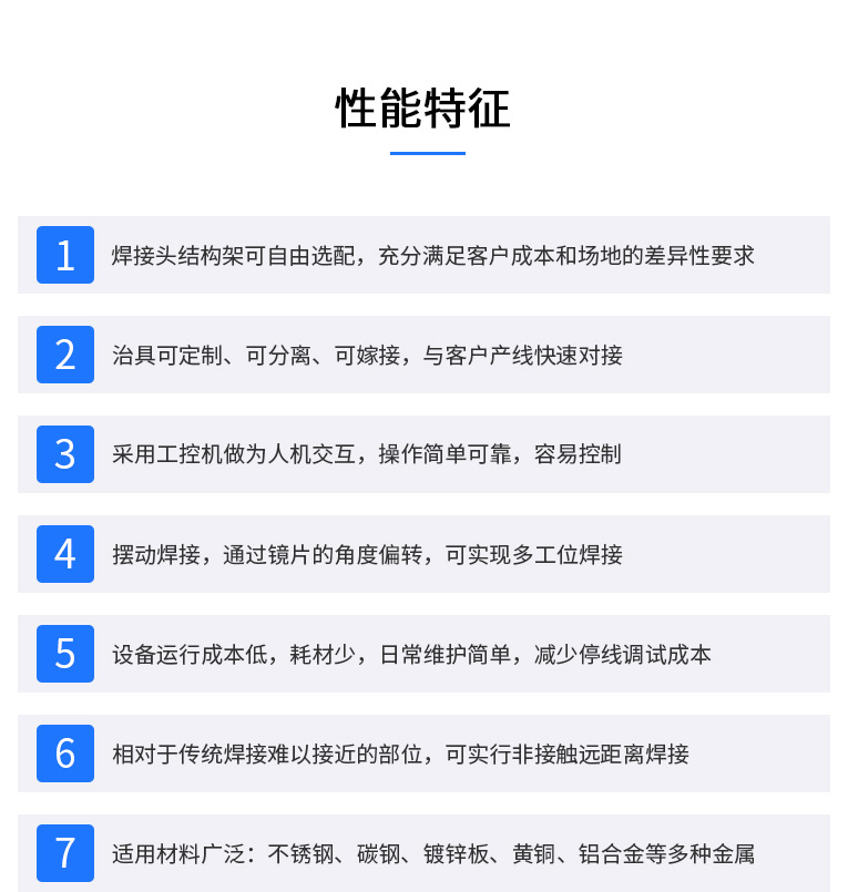 2、強大的PC控制,易于編程、調(diào)試和維護。可完成自動或半自動的點焊、對接焊、疊焊、密封焊,針對復(fù)雜的平面直線、圓弧及任意軌跡的焊接。